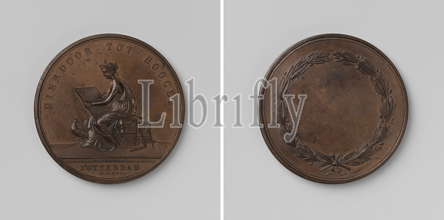 Drawing Academy 'Door to Hooger' in Rotterdam, medal of the first size, Bronze medal. Obverse: sitting woman with flame on head, representing Drawing, drawing on canvas that she holds on her knees, in front of her a rooster, behind her caliper and a square, leaning against a truncated column, on which is a burning light within a circle, cut off: inscription. Reverse: blank field within wreath of olive branches, Rotterdam, Drawing Academy 'Door to Hooger', Adriaan Bemme, 1817 - 1820, bronze (metal), striking (metalworking), d 5.2 cm × w 58.70 gr
