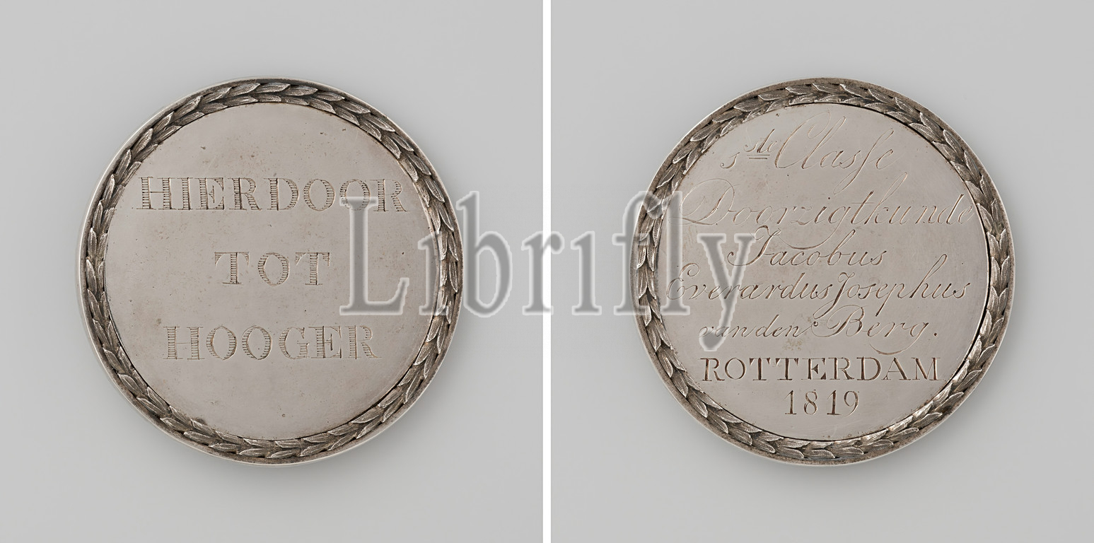 Drawing Academy 'Door tot Hooger, Rotterdam, medal awarded, Jacobus Everardus Josephus van den Berg, Doorzigtkunde, black-and-white medal, laurel wreath, high relief, Front, inscription, Reverse, Jacobus Everhardus Josephus van den Berg, Drawing Academy 'Door, Hooger, Kruisting, 1819, black-and-white, metal, engraving