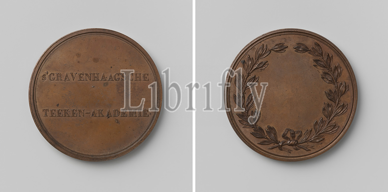 Drawing Academy, Academy, Fine Arts, Hague, Bronze Medal, Front, inscription, Reverse, blank field within laurel wreath, drawing academy Pictura, Utrecht, 1834, bronze, metal, striking, metalworking