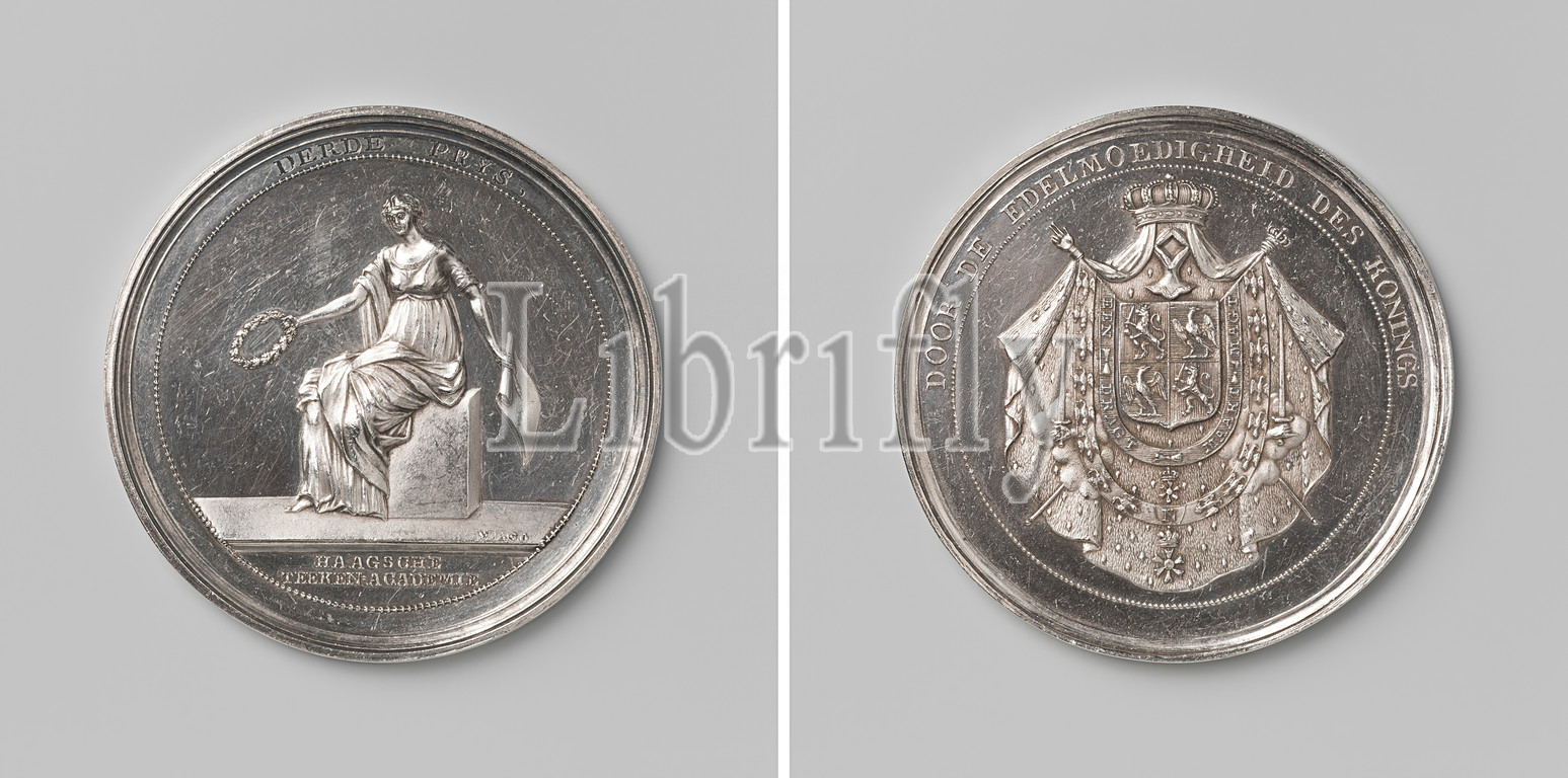 Drawing Academy Pictura in The Hague, medal awarded as third prize, in honor of Louis-Napoleon, King of Holland, Silver medal. Obverse: woman with laurel wreath and half unrolled sheet of paper in hands, sitting on block of stone within circumference, cut off: inscription. Reverse: helmeted coat, hanging with orders from Legion d'Honneur and Union, hand with sword on both sides: behind it ermine cloak under crown inside circumference, The Hague, Lodewijk Napoleon Bonaparte, Confrerie Pictura, drawing academy Pictura, Wilno, Netherlands, 3-Jan-1808, silver (metal), striking (metalworking), d 5.4 cm × w 44.85 gr