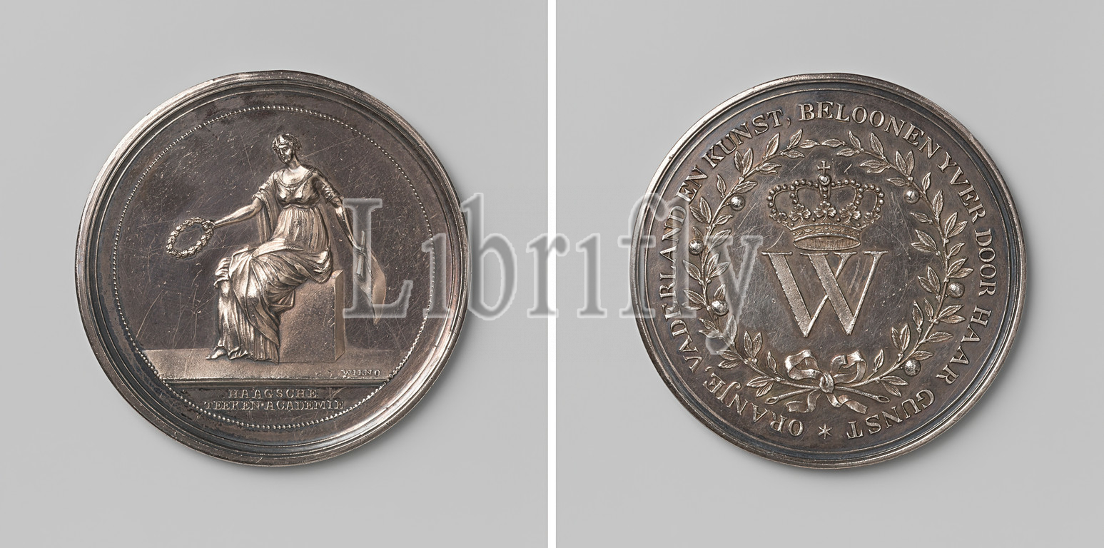 Drawing Academy Pictura in The Hague, Silver Medal. Obverse: woman with laurel wreath and half unrolled sheet of paper in hands, sitting on block of stone within circumference, cut off: inscription. Reverse: crowned letter W inside wreath of orange branches and circumscription, The Hague, Pictura drawing academy, Wilno, Netherlands, 3-Jan-1808 - 1813, silver (metal), striking (metalworking), d 5.5 cm × w 43.84 gr