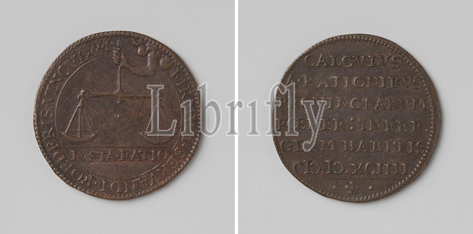 Drawing up, account, independent Dutch regions, calculation token, Council, State, Copper token, Obverse, hand, clouds holds balanced scales within, circle, cut off, inscription, Reverse, Dordrecht, 1594, copper, metal, striking, metalworking