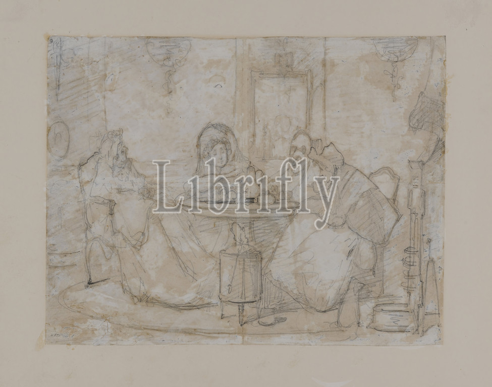 drawing, Alexander Hugo Bakker Korff, ca.1865, gouache, pencil, paper, signed, Carrier: 20.7 x 26.7cm (207 x 267mm), Daylight: 21.5 x 27.5cm (215 x 275mm), With passe-partout: 30 x 42.5cm (300 x 425mm), cat, chair, reading, woman, drink, interior, table, Drawing with pencil and white gouache, depicting four ladies at the coffee table. In front of a wall with wide panels, against which a Louis XVI mirror hangs, four ladies sit behind a round table with coffee utensils. On the far left, an old lady turned three-quarters to the right, wearing a lace cap and wide dress. In the center, seen from the front, a lady reading from a newspaper. She is wearing a big hat with a veil. Then three quarters to the left used to a lady wearing a big hat with veil and glasses. On the far right is a lady, seen from the side, drinking a little bent over from her cup. She is wearing a big cap and a scarf. In the foreground in the middle a tea stove with a kettle and on the right a chimney with a built-in fireplace, in front of which there is a cat. Not signed, 1924