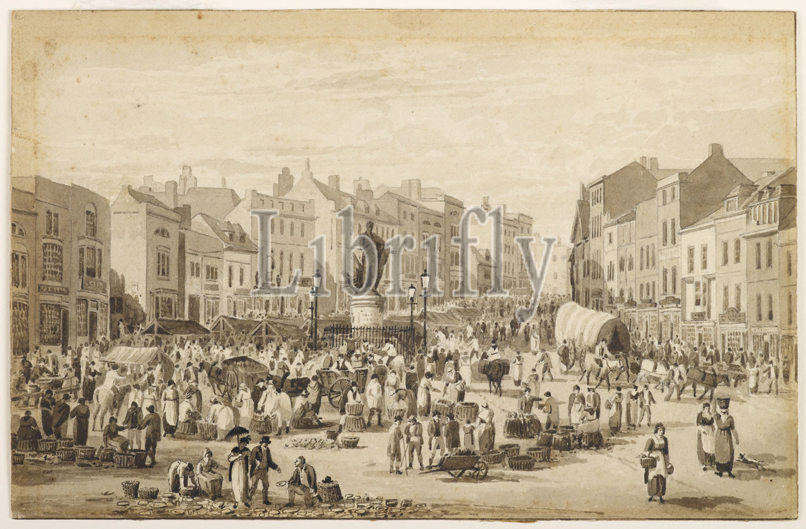 Drawing, The Bull Ring & Nelson Statue, Birmingham, 1845 Attributed to: Thomas Allom (Previously attributed to David Cox), Social history, Ink, Topographical Views, Marketplace, Birmingham history, Wash drawing