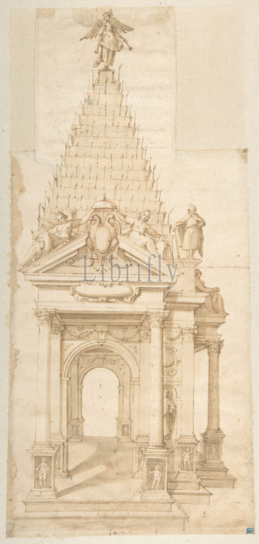 Drawing, Catafalque, Philip II, Spain, 1598, Pen, brown ink, washes, 18-3/4 x 8-3/4, 47.6 22.2 cm, Drawings, Alessandro Casolani della Torre, Italian, Siena, 1552–1606