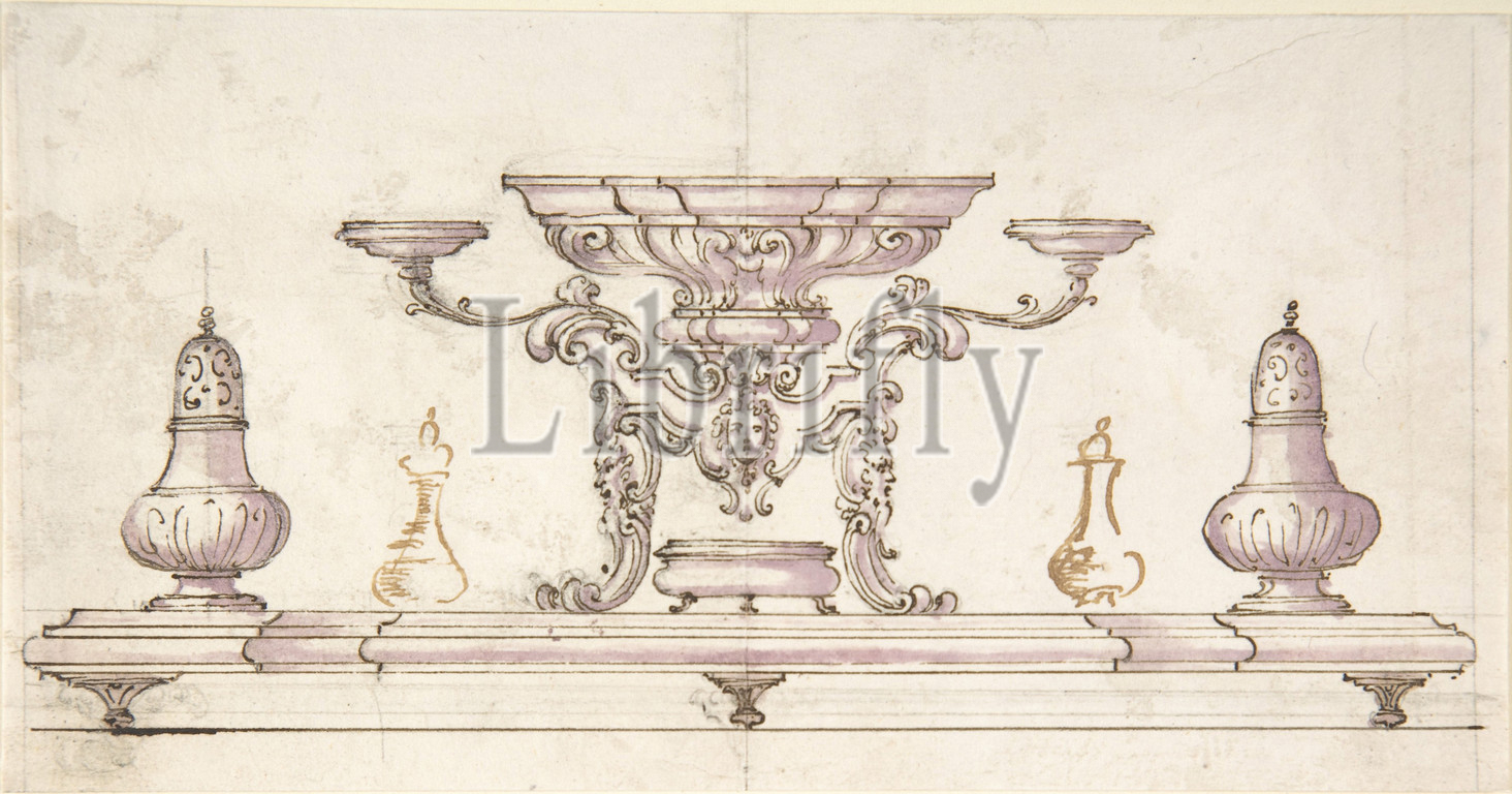 Drawing for Centerpiece and Salt Cellars, 18th century, Pen and lavender wash, 3-1/2 x 6-3/4 in, Drawings, Anonymous, Italian, 18th century