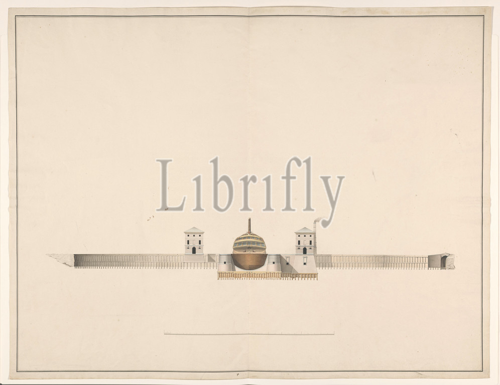 Drawing, double dry dock, Hellevoetsluis, Ship, dry dock, two buildings, right, smoking chimney, Bottom, drawing, unfinished scale, floating dock, Jan Blanken Jansz, Netherlands, c, 1802, paper, ink, watercolor, paint, brush