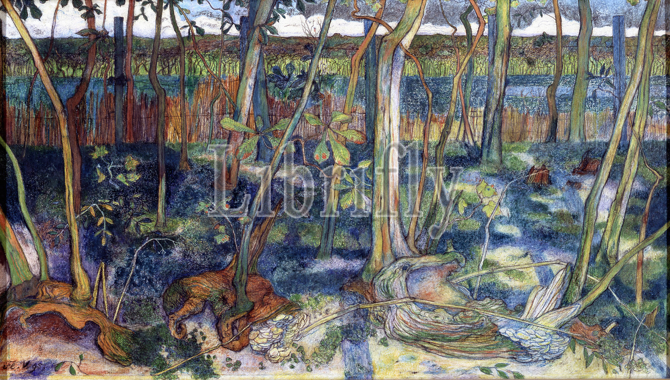 drawing, Floris Verster, 1895, Signature front lower left, Fl. V. 95, wax crayon, paper, signed, Carrier, 26.2 x 45.3cm, 262 x 453mm, Daylight, 25.5 x 44.6cm, 255 x 446mm, passe-partout, 42.5 x 60cm, 425 x 600mm, landscape, forest, life, a glass jar, a white ointment tray., a tablecloth painted, red-brown tone, a white paper, a drawing portfolio, a wrinkled folder, L'ART .... DESSINER., contains, white-glazed ointment tray, a black glass bottle., folder lies diagonally, base, a plaster statue, a large green bottle. Signed bottom right., painting, a wooden frame.