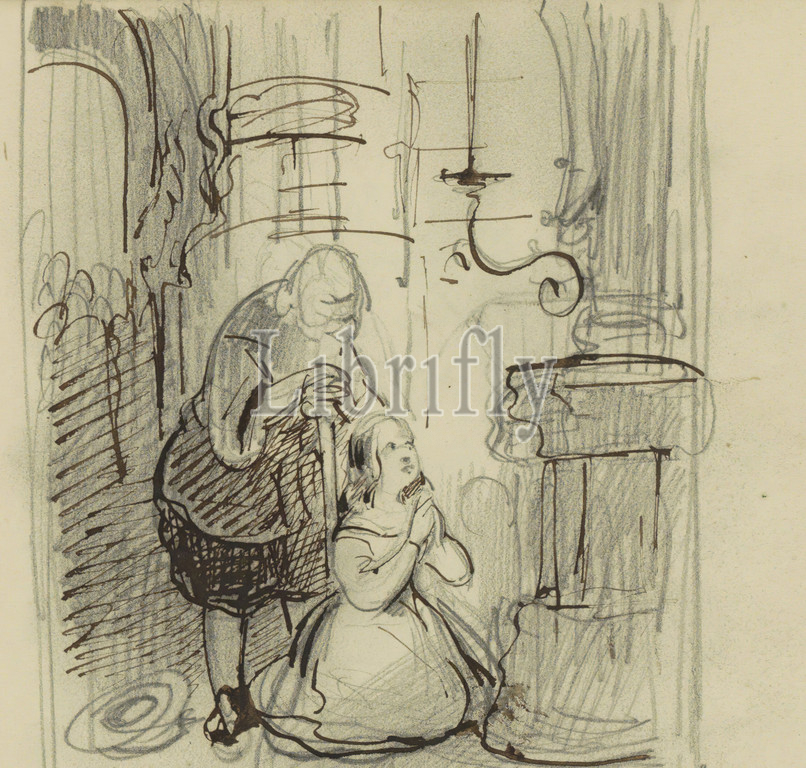 Drawing, frame, Sheet 24 verso, sketchbook, 36 sheets, Man, praying girl, interior, Willem Hendrik Schmidt, 1819 - 1849
