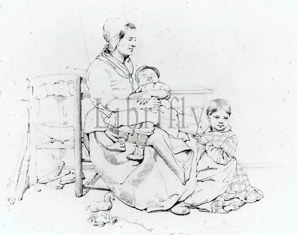 drawing, Jacobus Ludovicus Cornet, ca.1860, pencil, paper, signed, Carrier, 28 x 34.7cm, 280 x 347mm, Daylight, 28.7 x 35.2cm, 287 x 352mm, passe-partout, 42, 5 x 60cm, 425 x 600mm, woman, interior, study, child, Drawing depicting, study, a young woman, two children, interior., woman, sitting, feet, turned, right, a sleeping child, lap., supports, child, right arm, holds, book, left hand., second child, sitting, floor, front, holding, book., foreground, a toy horse, left, a cot, woman., signed, 1956