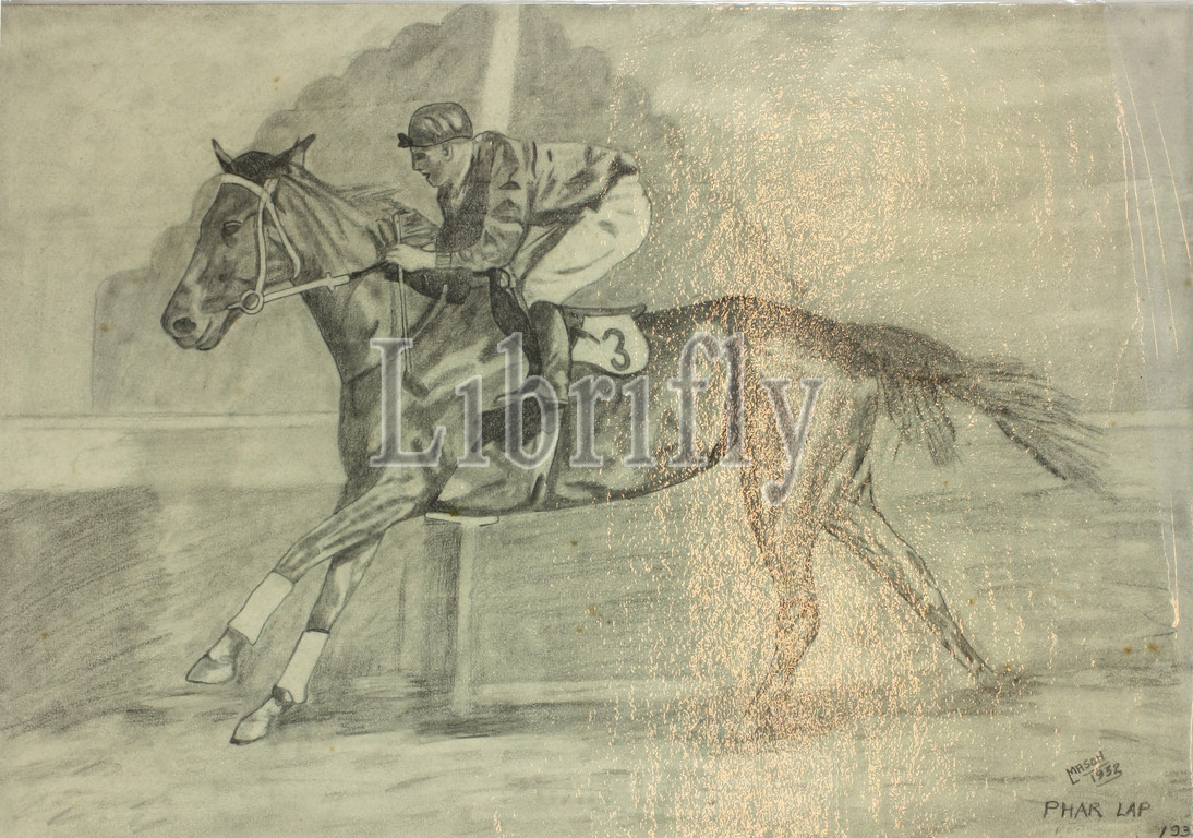 Drawing - Les Mason, Phar Lap Winning the 1929 Rosehill Guineas, 1932, This drawing was of Phar Lap winning the Rosehill Guineas in Sydney in 1929 was done by Les Mason. He attended the race, and drew this from memory three years later in 1932, after Phar Lap's death.