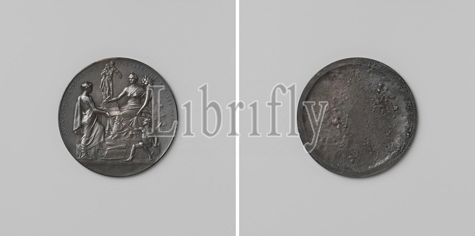 drawing lesson [?], One-sided silver medal. Obverse: woman with a halo and filled horn of abundance sitting on a high throne, holding a large spring in her left hand, with which she reaches for an open book, which is held before her by her woman, Mercury sits on a stairway of elevation with a throne on it, with hat and staff, and extends a laurel branch with her right hand outstretched, between both partially unrolled pieces of parchment, in background statue of man who carries someone on his back within circumscription. Reverse: blank, Louis Eugène Mouchon, Paris, 1887 - 1888, silver (metal), founding, d 5 cm × w 32.52 gr