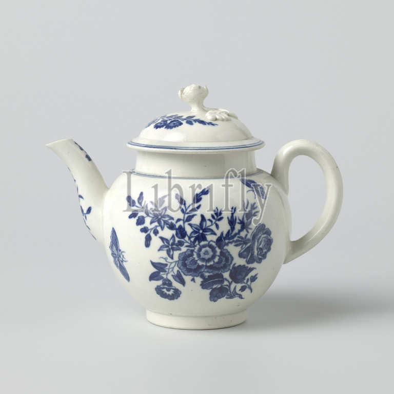 Drawing pot, painted flowers, insects, Porcelain drawing pot, painted, blue flowers, white ground, Marked, letter L, Langley, Langley Mill, 1790, 1800, porcelain, material