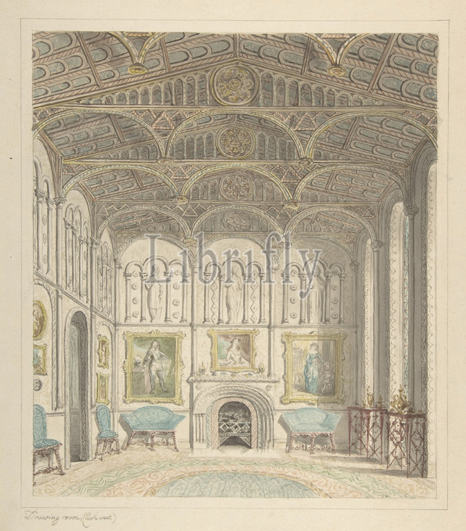 Drawing Room, Lea Castle, Looking West, ca, 1816, Watercolor, brush, brown ink, graphite, sheet, 14 3/16 x 12 15/16, 36.1 32.8 cm, Attributed to John Carter, British, London, 1748–1817