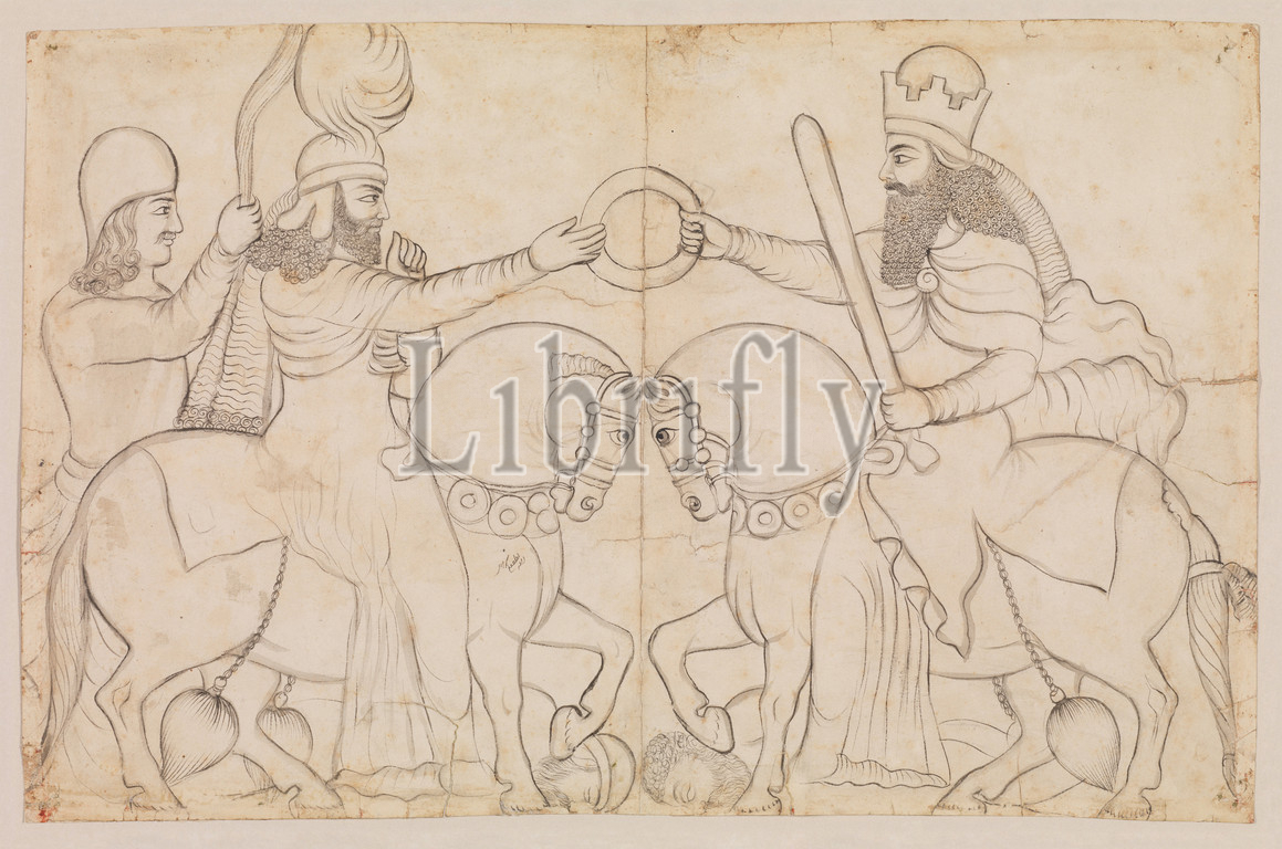 Drawing, Sasanian rock relief, Ardashir I, r, .D, 224-241, Zoroastrian divinity Ahura Mazda, Naqsh, Rustam, southern Iran, 1860, drawing, Iran, Qajar, Paper, pencil, ink, 12.76 x 15.75, 32.41 40.01 cm, Paper-Graphics, Lutf 'Ali Khan, 1797–1869, rock, relief, depicts, investiture, receives, ring, office, Ahura, supreme Zoroastrian, god, king, horseback, god wears, caftan, prestigious riding, costume, period, fan-bearer stands
