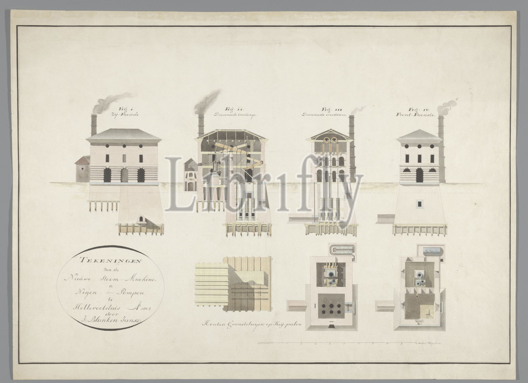 Drawings of the new steam engine with nine pumps in Hellevoetsluis (title on object), Technical drawing of a steam engine. Four side views of which two cross-sections and three floor plans in yellow / gray / pink / light blue. Under scale in Rijnlandse feet. Inscription: (see title). Signed, l.o .: in cartouche: J. Blanken Jansz. Dated, l.o .: in cartouche: Ao 1802, Netherlands, Jan Blanken Jansz. (mentioned on object), 1802, paper, ink, watercolor (paint), pen, h 46 cm × w 63 cm