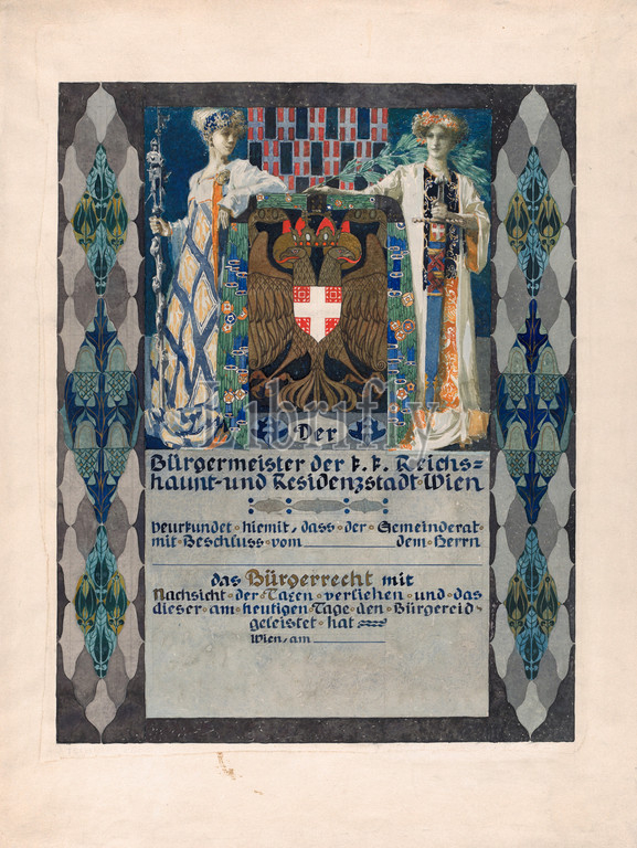Drawings and Prints, Drawing, Design for a certificate to accompany the award of a bronze medal for years of dedication to a single employer, awarded by the Guilds Society of Lower Austria, Artist, Erwin Puchinger, Austrian, Vienna 1875–1944 Vienna, Puchinger, Erwin, 1875, 1944, 0