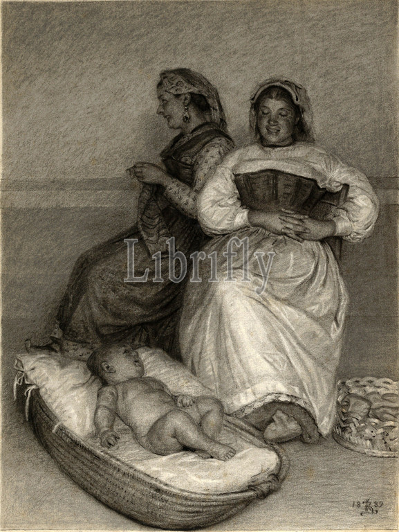 Drawings Prints, Drawing, Two, Seated, Italian, Women, Baby, Cradle, Artist, Kristian Zahrtmann, Danish, Rønne 1834–1912 Frederiksberg, Zahrtmann, Kristian, 1834, 1912, 1889