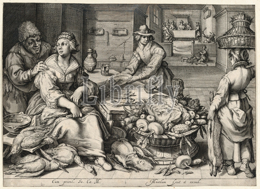 Drawings Prints, Print, Kitchen, Scene, Maid, Drawing, Poultry, Parable, Rich, Man, Poor, Lazarus, Market, Scenes, Biblical, Background, Artist, Jacob Matham, Netherlandish, Haarlem 1571–1631 Haarlem, Matham, Jacob, 1571, 1631, ca. 1603