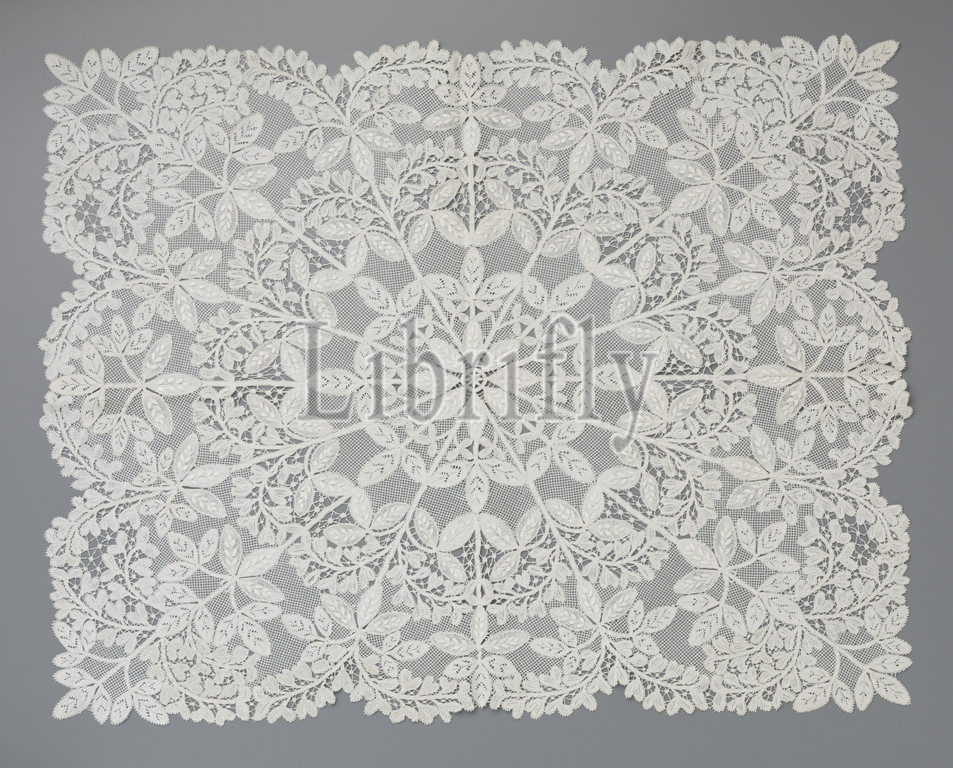 Dress, bobbin lace, rosette radiused, golden rain branches, flowers, natural-colored bobbin lace, duchesse lace, Rectangular model, irregularly scalloped, center, rosette flower, eight pointed oval leaves, sixteen straight lines, placed, radius, surrounded, three-part leaves, curving flower clusters, golden shower, motifs, largely, net, linen, openwork edges, cut-outs, connected, lattice soils, braiding soils, alternate, concentric 'circles, edges, leafs, applied, pointed oval leaves, design drawing, lace patterns, preserved, rug, Louise Wilhelmina van der Meulen-Nulle, Apeldoorn, c, 1912, cotton, textile, l 90