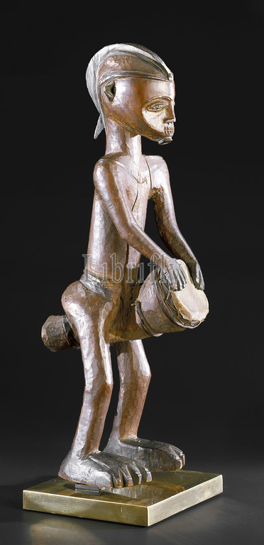 drummer, Mbala people, 1920-1950, wood, pigment, skin, fiber, brass, iron, H, 20-3/16, African Art