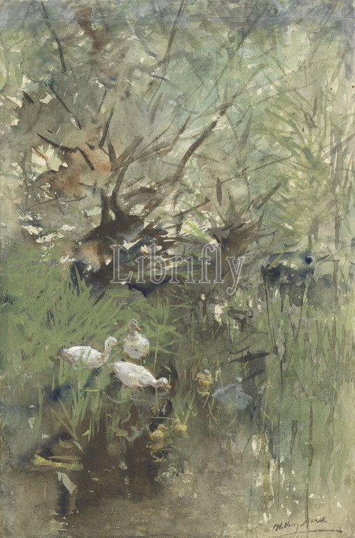 Ducks, willows, domestic waterbirds, Willem Maris, mentioned, object, 1844, 1910, paper, watercolor, paint, brush