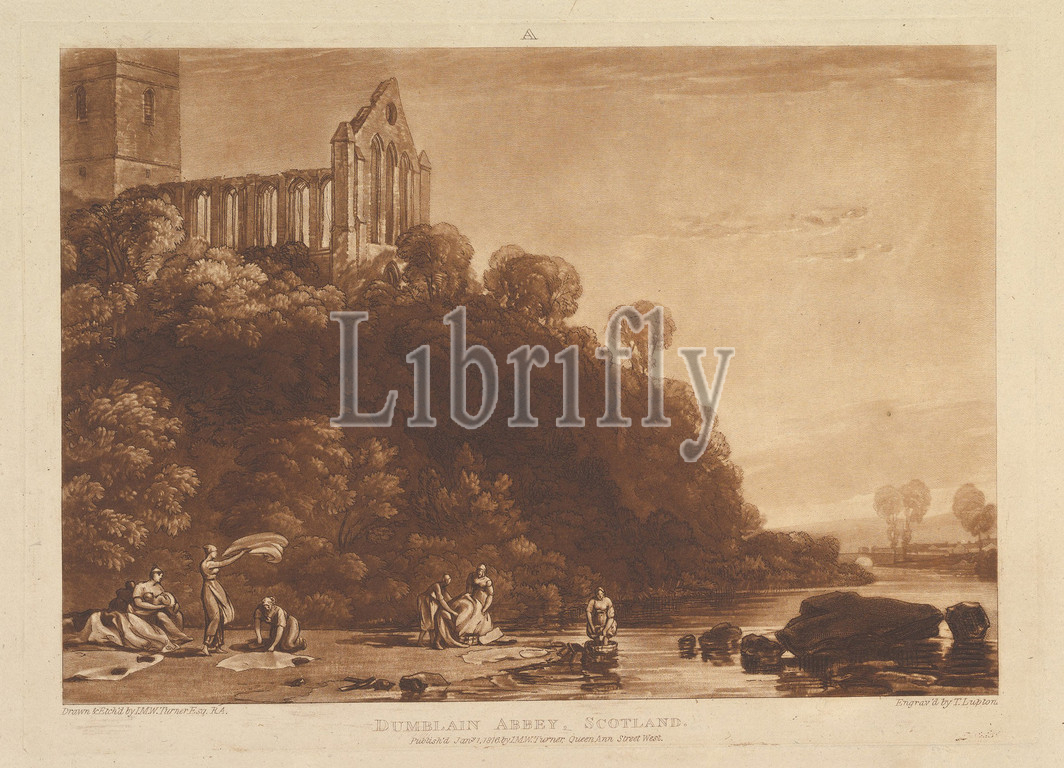Dumblain Abbey, Scotland (Liber Studiorum, part XI, plate 56), January 1, 1816, Etching and mezzotint; first state of four (Finberg), plate: 7 7/16 x 10 9/16 in. (18.9 x 26.8 cm), Prints, Designed and etched by Joseph Mallord William Turner (British, London 1775–1851 London), Turner distilled his ideas about landscape In 'Liber Studiorum' (Latin for Book of Studies), a series of seventy prints plus a frontispiece published between 1807 and 1819. To establish the compositions, he made brown watercolor drawings, then etched outlines onto copper plates