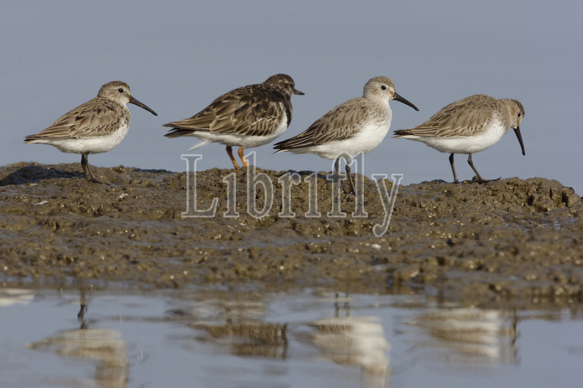 Dunlins with Turnstone, Calidris alpina, Netherlands