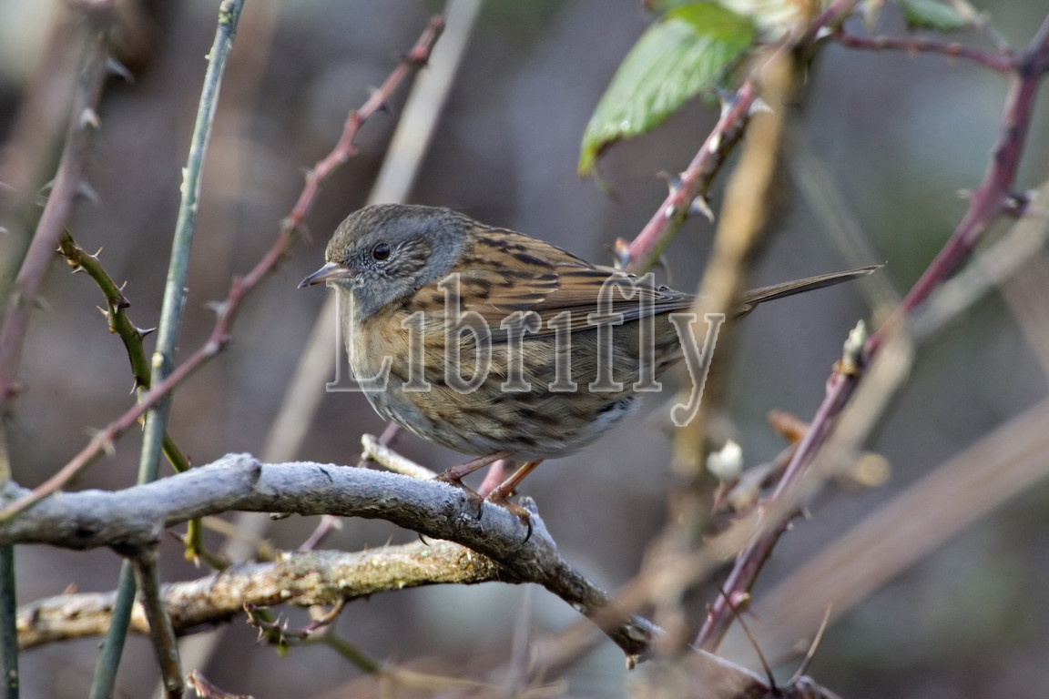 Dunnock perched on branch, Prunella modularis