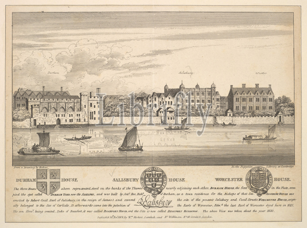 Durham House, Salisbury House and Worcester House on the Thames, 1808, Etching and engraving, sheet: 6 3/4 x 9 1/4 in. (17.1 x 23.5 cm) cut outside the image and text but within the platemark., Prints, After Wenceslaus Hollar (Bohemian, Prague 1607–1677 London), Copy after a drawing by Hollar. View from the River Thames, with Durham House on the left, Salisbury House in the centre and Worcester House on the right; reflections on the water and some small boats; the view as it was around 1630