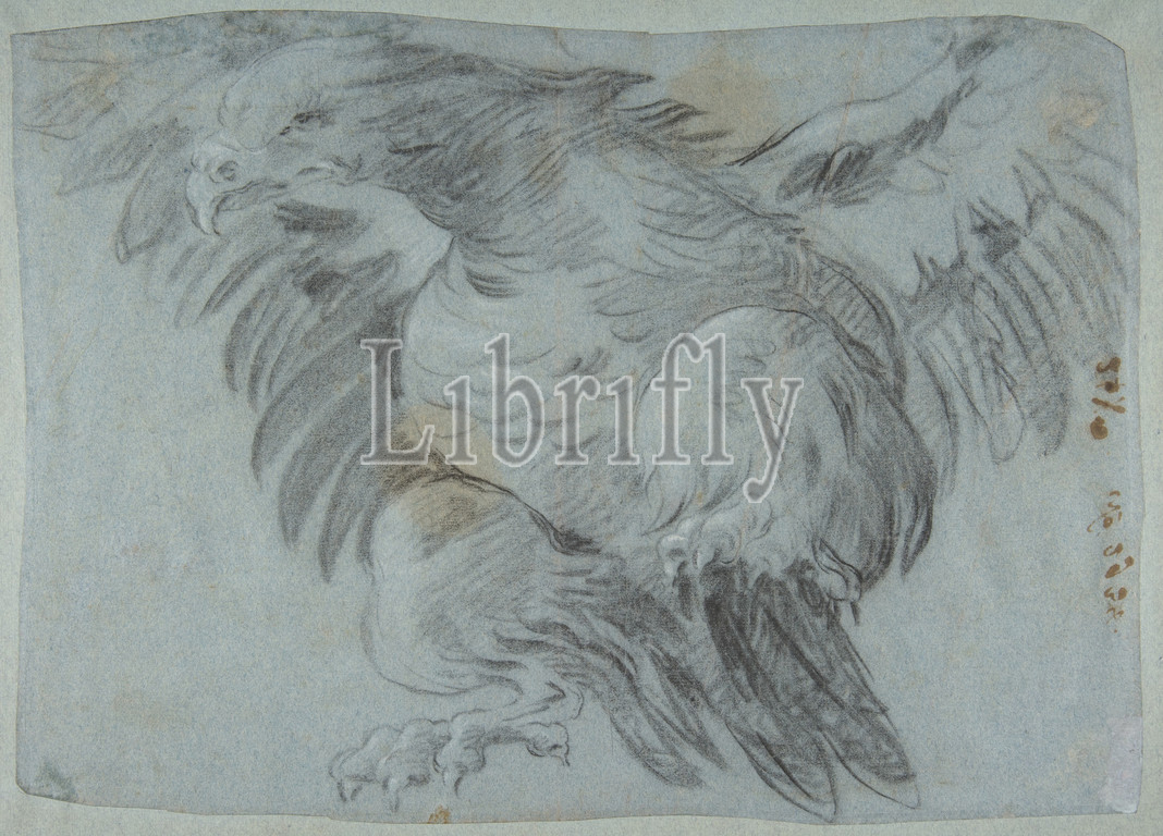 Eagle, Wings Spread, 1696–1770, Charcoal, highlighted, white chalk, blue paper, 13-11/16 x 9-3/4, 34.7 24.8 cm, Drawings, Giovanni Battista Tiepolo, Italian, Venice, Madrid, George Knox, attributed, drawing, Battista, Tiepolo, suggested, study, eagle, hovering, sky, ceiling fresco, 1743, Palazzo Pisani, Moretta, San Polo