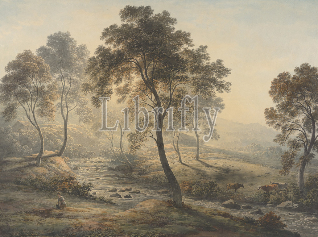 Early Morning near Loch Katrine in the Trossachs, Scotland, before 1831, Graphite, watercolor and gum arabic, sheet: 16 x 21 9/16 in. (40.7 x 54.7 cm), Drawings, John Glover (British, Houghton-on-the-Hill, Leicester 1767–1849 Launceston, Tasmania), Glover, known as the English Claude Lorrain, here applied that seventeenth-century master’s light-filled Italianate vision to a northern subject. As a founding member of London’s Old Watercolour Society, Glover demonstrated the medium’s ability to describe atmospheric effects, and his drawings became so popular that he commanded prices second only to J