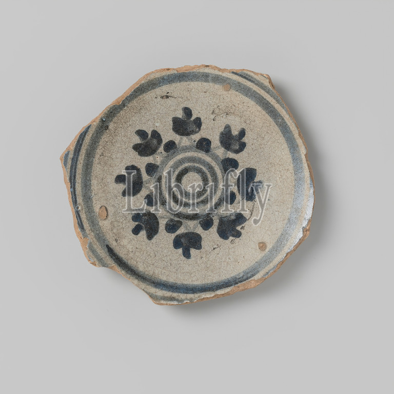 Earthenware saucer shard, drawing, stylized flower, blue, 1500, 1799, earthenware, glaze