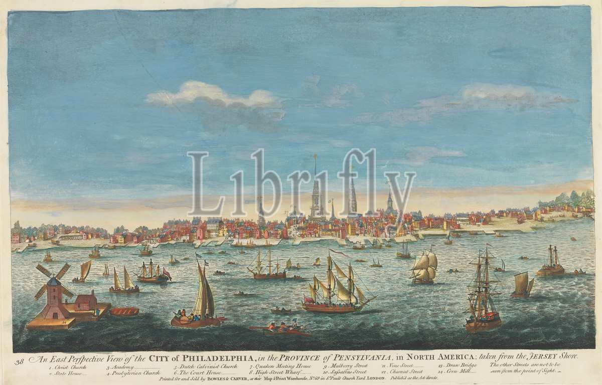 East Perspective View, City, Philadelphia, Province, Pensylvania, North America, Jersey Shore..., Print, J, Carwitham, active 1720–1740, George Heap, active 1715–1760, American, Published, Carington Bowles, 1724–1793, British, 1778, Line engraving, hand coloring, watercolor, moderately thick, slightly textured, cream wove paper, Sheet, Plate, Image, boats, boats, churches, cityscape, marine art, sails, ships, Pennsylvania, Philadelphia, United States, America