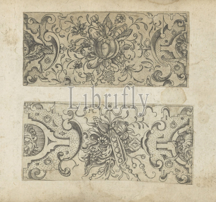 Edge decoration, fruit cluster, pod, cluster, Flanked, two half cartouches, mascaron, print, part, album, ornaments, art, ornament, cartouche, fruits, vegetables, mask, Andreas Luining, mentioned, object, 1589, 1593, paper, engraving