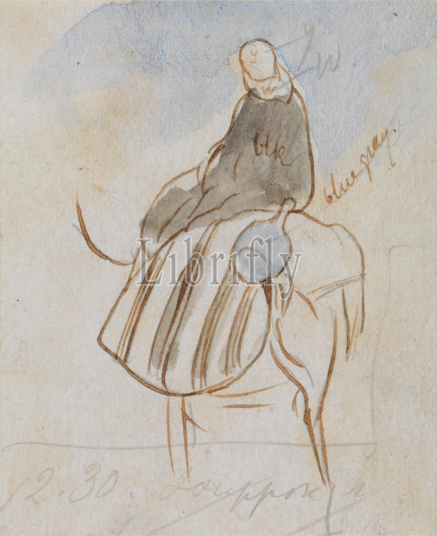Egpytian Man on Camel, Edward Lear, 1812–1888, British, 1867, Watercolor, graphite, pen and brown ink on medium, slightly textured, cream wove paper, Sheet: 2 1/16 x 1 11/16 inches (5.2 x 4.3 cm), blanket (covering), camel (mammal), Egyptian, figure study, genre subject, man, robe, seated, study (visual work), turban, Egypt