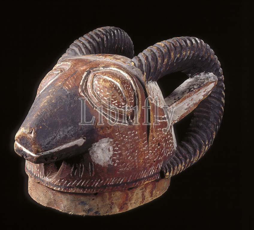 Egungun helmet mask/ram head motif, Yoruba people, wood, pigment, 19-7/8 x 19-7/8 x 12 in., African Art