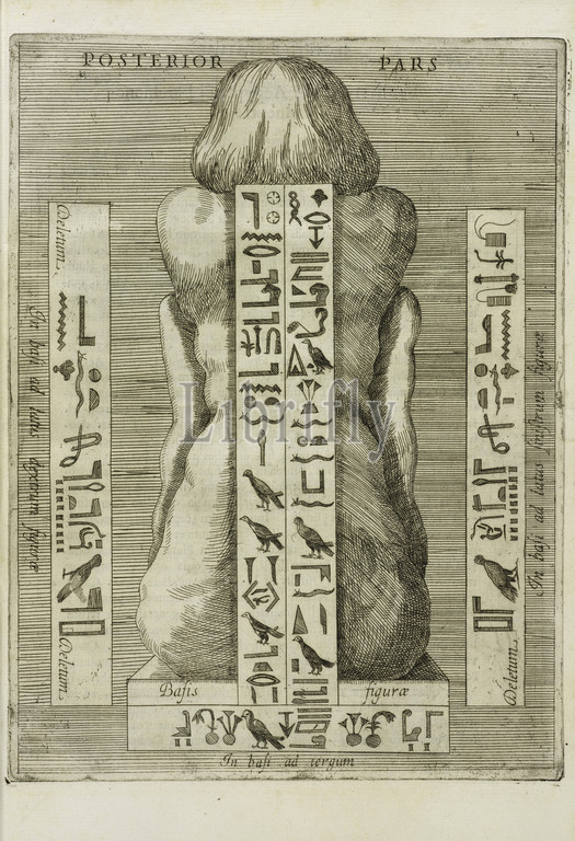 Egyptian statue, rear view, Ad Alexandrum VII. Pont. Max. Obelisci Aegyptiaci: nuper inter Isaei Romani rudera effossi interpretatio hieroglyphica, Kircher, Athanasius, 1602-1680, Etching, 1666