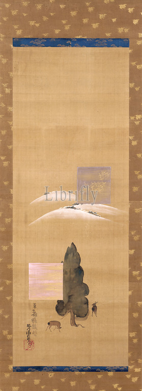 Eight Views, Yamato, Snow, Mt. Mikasa, Deer, Kasuga Field, Nakamura Hōchū 中村芳中, Japanese, Edo, 1800, ink, Color, Silk, 72 x 19-1/2, scroll, 38-3/4 x 14-1/8, image, Signed, Hochu sha no Square relief seal, lower left corner overlapping, bottom, signature, Hochu, Asian Art