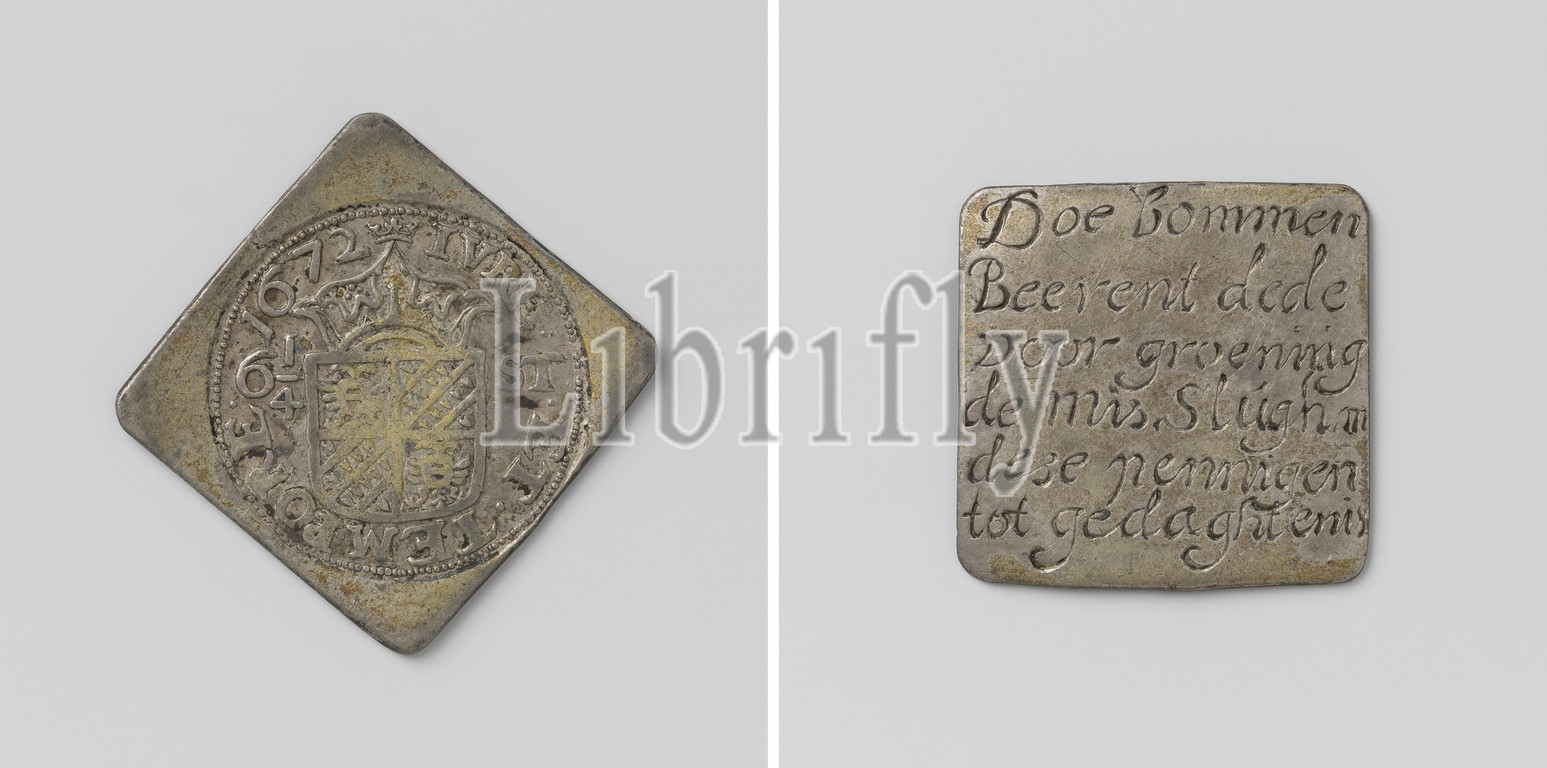 Eighth thaler, Siege of Groningen, Eighth Thaler. diamond shaped emergency coin with rounded corners. Obverse: crowned coat of arms between the value indication within the cover. Reverse: inscription 'Do Bommen Beerent dede for the Mass, do Slugh m dese tokens ot gedaghtenis', Groningen, anonymous, 1672, silver (metal), engraving, h 2.7 cm × w 2.7 cm × w 3.23 gr