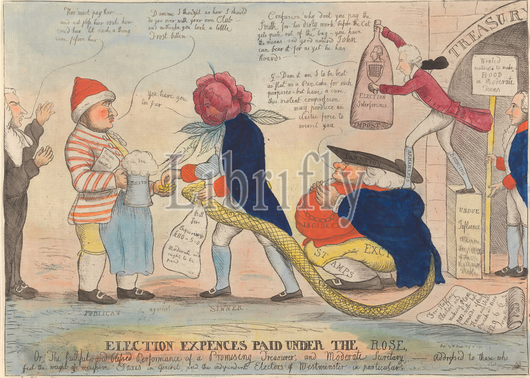 Election Expenses paid under the Rose, or, The Faithful and Blessed Performance of a Promising Treasurer, and Moderate Secretary - Addressed to those who feel the weight of excessive taxes in general, and the independent electors of Westminster ...., William Dent, active 1784–1793, 1791, Etching with watercolor on laid paper, Sheet: 9 7/8 x 13 7/8in. (25.1 x 35.2cm)