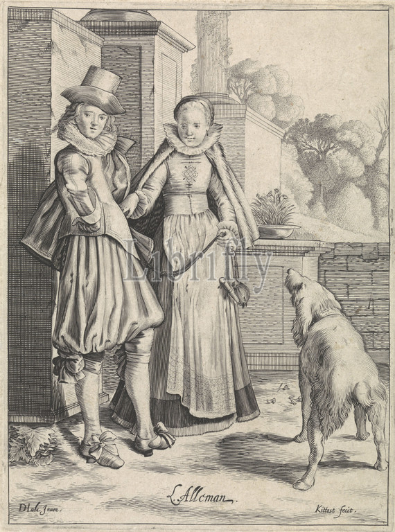 Elegant couple, German clothing L 'Allemand, title, object, L' Allemand, costume print, German fashion, ca, 1620, Costumes, Europe, series title, front, building, garden wall, elegant couple, German clothing, dog, couple, print, part, series, six prints, costumes, Clothes, costume, men's clothes, clothes, women's clothes, Europeans, Germans, head-gear, hat, neck-gear, clothing, NAME, upper part, body, DOUBLET, trousers, breeches, etc, BREECHES, coat, bow, ornamental men's clothing, shoes, sandals, sleeves, CAPE, apron, purse, money-bag, belt, girdle, waistband, clothing accessories, PURSE, KNIFE, table-knife, Germany, Cornelis van Kittensteyn, Netherlands, 1610, 1638, paper, engraving