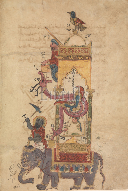 Elephant Clock, Folio, Book, Knowledge, Ingenious Mechanical Devices, al-Jazari, dated .H, 715/.D, 1315, Syria, Ink, opaque watercolor, gold, paper, 11 13/16 x 7 3/4in, 30 19.7cm, Codices, page, comes, treatise, fantastic devices, invented, author al, Jazari, elephant clock, intricate, every half, hour, bird, dome whistled, man, dropped, ball, dragon, mouth, driver hit, elephant, goad