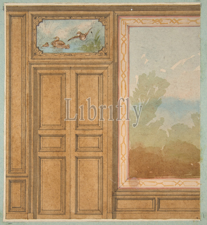 Elevation, paneled wall, mural, tapestry, double doors surmounted, painting, ducks, 19th century, pen, ink, watercolor, laid paper, inlaid, blue wove, Drawings, Jules-Edmond-Charles Lachaise, French, died, 1897, Eugène-Pierre Gourdet, born Paris, 1820