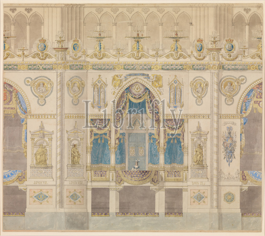 Elevation, Royal Box, Coronation, Louis XVIII, Reims Cathedral, n.d, Pen, black ink, watercolor, 30 3/16 x 34 1/8, 76.6 86.6 cm, Drawings, Charles Percier, French, Paris, 1764–1838, Pierre François Léonard Fontaine, Pontoise, 1762–1853