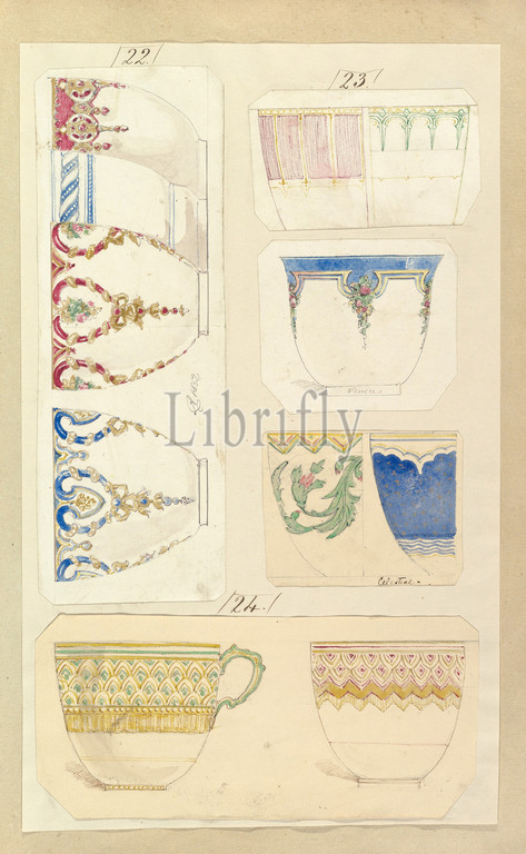 Eleven Designs for Decorated Cups, including Venice and Celestial Patterns, ca. 1852, Pen and ink, watercolor and gouache, sheet: 16 3/4 x 11 7/16 in. (42.5 x 29 cm), Alfred Henry Forrester [Alfred Crowquill] (British, London 1804–1872 London)