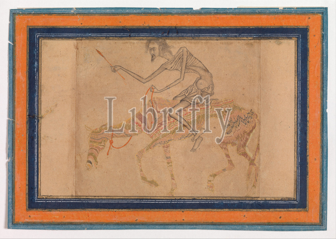 Emaciated Horse, Rider, ca, 1625, Attributed, India, Deccan, Bijapur, Ink, opaque watercolor, gold, paper, marbleized paper, 4 x 6 3/8in, 10.2 16.2cm, Codices, Mystical interpretations, yearnings, soul, ascribed, striking images, mortification, established genre, Indian painting, seventeenth century, cases, motif, emaciated horse, rider, created, pounced outlines, charbas