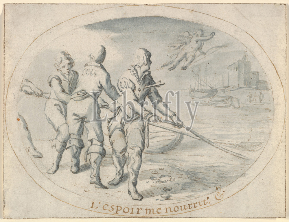Emblem Drawing ('Hope sustains me'), early 17th century, Pen and brown ink, brush and blue-gray ink; double framing line in pen and brown ink, by the artist; framing line in pen and brown ink, by a later hand, Sheet: 5 × 6 1/2 in. (12.7 × 16.5 cm), Drawings, Jacob Matham (Netherlandish, Haarlem 1571–1631 Haarlem)