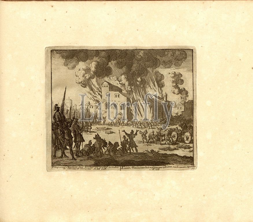 Emperor Maximin burns a large number of Christians, around the year 237, Parallel title: Emperor Maximinus, many thousands of Christians burn up, about A nn o 237, copperplate engraving, 27.), p. 63, Luyken, Jan (inv. et fec.), Jan Luyken: Théâtre des martyrs: depuis la mort de J.Christ jusqu'à present: représenté en très belles tailles-douces = Schau-Bühne der Martyrer; gezeichnet und in Kuppfer gestochen. Leyde: chez Pierre Van der Aa, [1711]