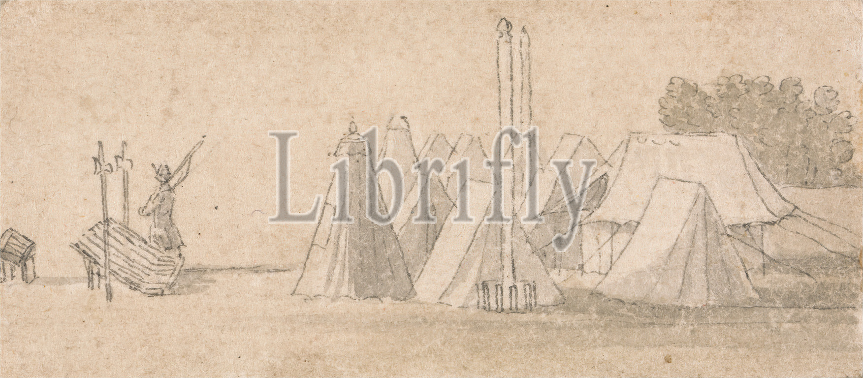Encampment Scene, Thomas Sandby RA, 1721–1798, British, undated, Watercolor, black ink, and graphite on medium, slightly textured, cream laid paper, Sheet: 1 3/8 × 3 inches (3.5 × 7.6 cm), genre subject, military camp, tents